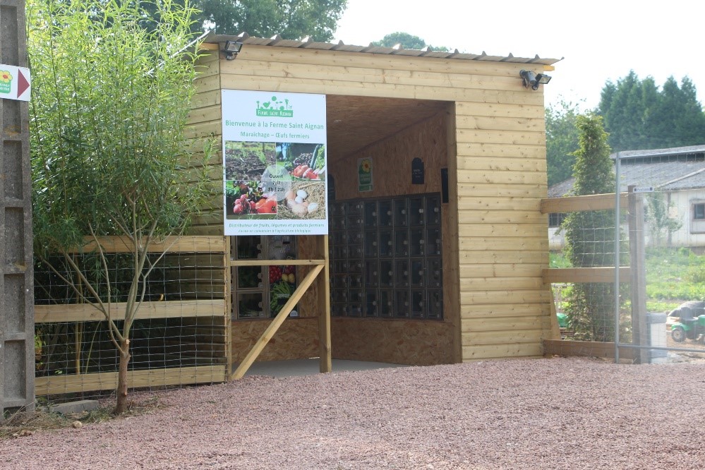 Depuis juin 2017, 100% de notre production est disponible dans notre libre‑service situé sur la ferme. Le distributeur automatique est ouvert tous les jours, 24/24. Il est régulièrement rechargé.